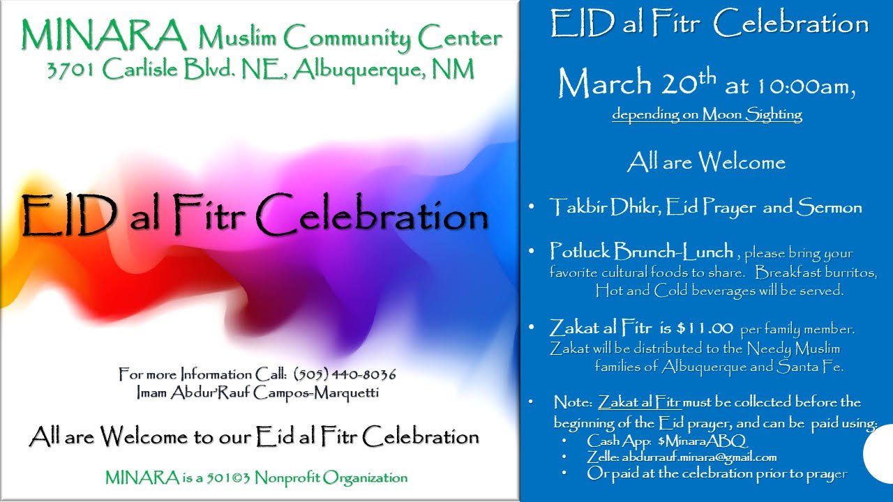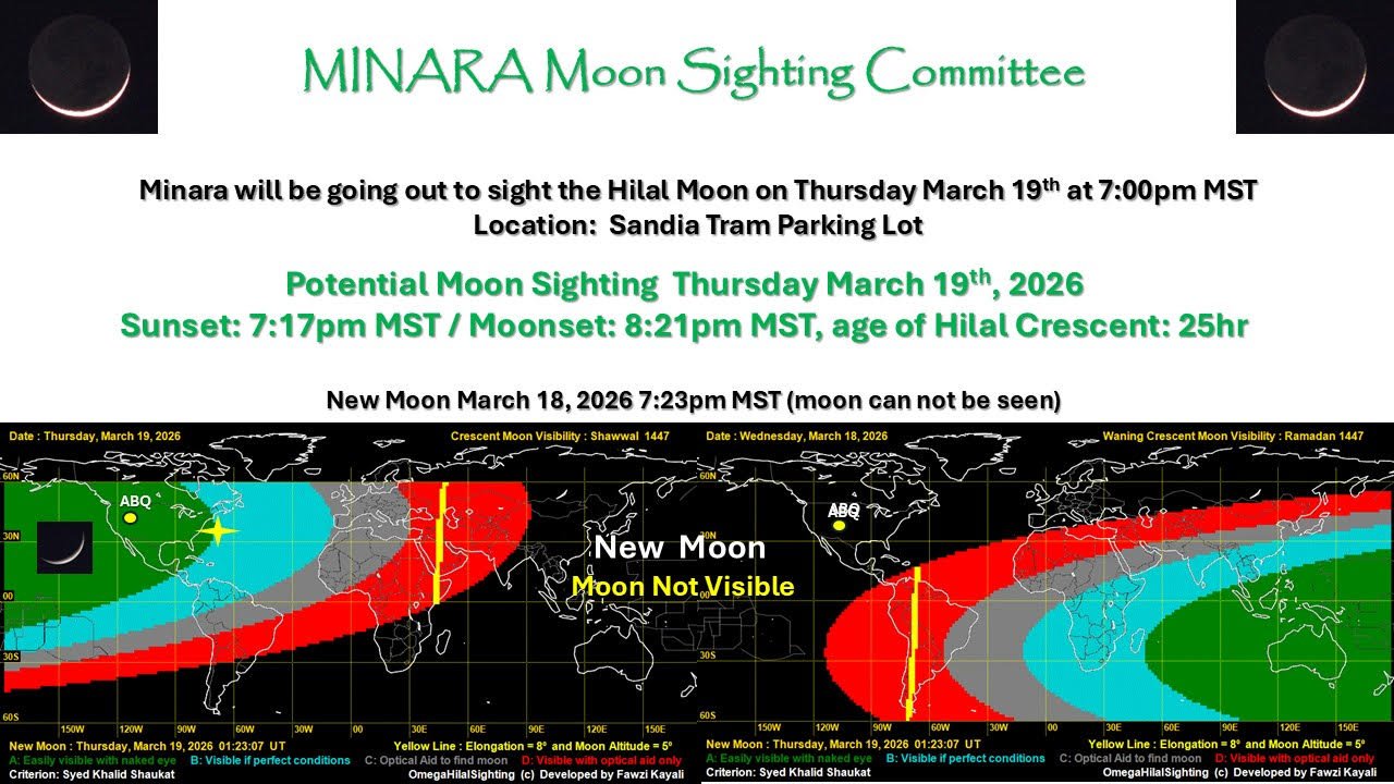 There will be a moon sighting attempt on Thursday, March 19 at 7pm MT. The moon sighting attempt will determine the start of Shawwal and Eid al-Fitr which could be March 20th at 10am when we begin the Eid prayer. Please send your Zakat al-Fitr ($11.00 per household member) prior to the start of Eid prayer. You may do so above through our payment portal.
