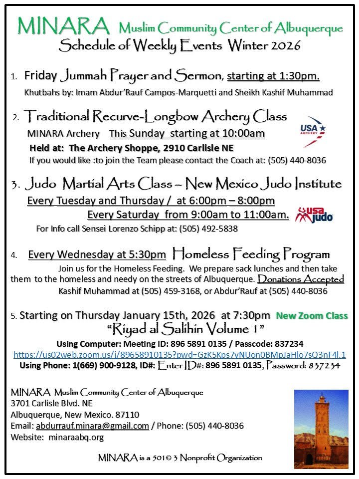 Welcome to the MINARA Muslim Community Center, a dedicated Islamic center located in the heart of Albuquerque, New Mexico. Our center serves as a welcoming space for both local and visiting Muslims. It aims to foster strong community ties, provide religious guidance, and support individuals in their spiritual journey. MINARA is a 501(c)3 nonprofit organization dedicated to serving the Albuquerque community in the areas of Homeless Feeding, Islamic Da’wah, Health & Wellness, Language Arts & Calligraphy, Martial Arts (Judo) and Archery Classes. Stay up to date on MINARA Facebook!